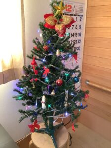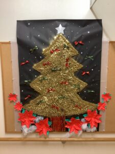 華やかになっています。入居者様達が製作されたツリーの壁飾りも