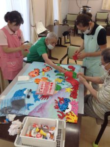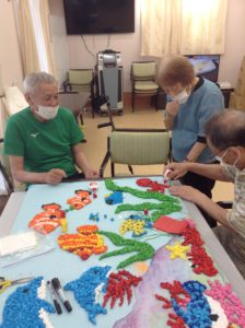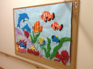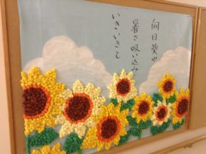 2022-07-29日常のこと 壁画製作 こんにちは~。 クローバーホーム成田の廊下は 向日葵が咲き、まるで水族館のように 魚たちが泳いでいます。 入居者様方の力作の壁画です。 スタッフブログ一覧に戻る