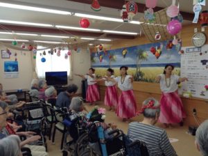 職員によるダンス?から始まり、 ボランティアさんによるフラダンス?、