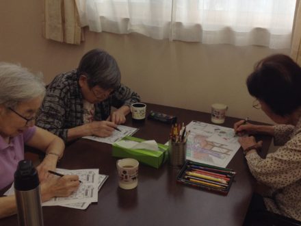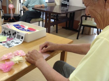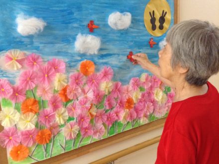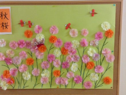 こんにちは〜? 入居者様と作製していた壁紙が完成しましたよ‼️ コスモスです? 花の色や全体のバランスを考えて皆さん一生懸命に作って下さいました〜! ありがとうございます?