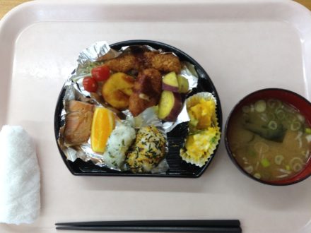 こんにちは? 今日のお昼ご飯のご紹介です? ◎2種のおにぎり ◎焼きシャケ ◎コロッケとエビフライ ◎ホクホクさつまいも ◎カボチャのさっぱりサラダ(胡瓜と玉ねぎあえ) ◎オレンジ ◎豆腐の味噌汁 皆さんに沢山召し上がっ…