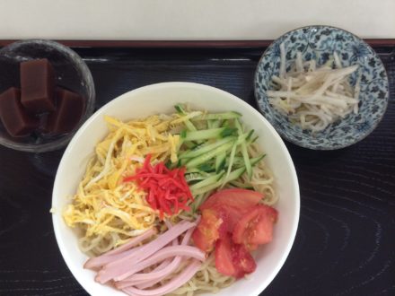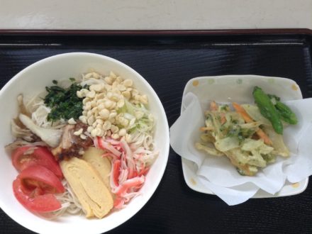 こんにちは〜? 今日のお昼ご飯は大好評のぶっかけ素麺‼️ 天ぷらと一緒に…? 具沢山のぶっかけ素麺になっていますよ〜? 入居者様もお腹いっぱい食べて頂きました❗️ 美味しい秘密は出汁のきいたつゆ✨ ごちそうさまでしたー?