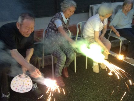 こんにちは〜? 流しそうめんの後は… 花火?をしました〜? この日は日中に久しぶりに雨が降り、外も過ごしやすい気温でした? 入居者様も花火は久しぶりのかたが多く、きれいな花火に喜んでいただきました? そして…