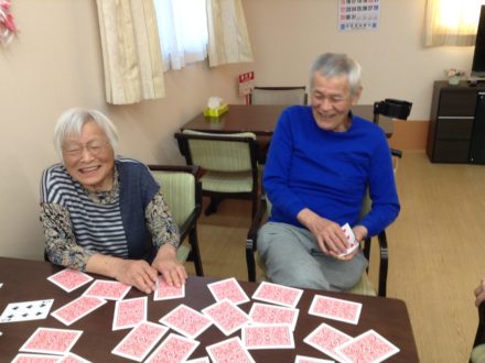 こんにちは? 今日はどんより雲で外も暗いです。 そんな本日は入居者様が集まりトランプをしましたよ❗️ 今日は皆さんで出来るように大きいトランプです? 皆んなで大笑いで過ごせました〜?