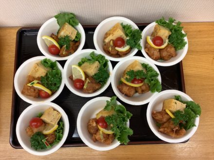こんにちは〜。 先日のお昼ご飯はバイキング形式で 召し上がって頂きました。 おしゃれなカップに盛り付けたお料理を 入居者様喜んで下さいました♫