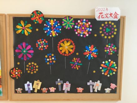 こんにちは〜。 花火大会をイメージした壁画が 完成しました。 キラキラ華やかで素敵な作品が 出来あがりました。