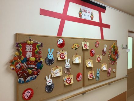 こんにちは〜? 入居者皆様には絵馬を作って頂き、 新しい年の抱負を書いて頂きました。 可愛いうさぎも出来上がりました?