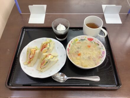 こんにちは〜😊 クローバーホーム成田の毎週日曜日の お昼ご飯はパンのメニューを召し上がって 頂いています。 キッチンスタッフの手作りメニューです。 今日はサンドイッチにクラムチャウダーと コーヒーゼリーでした。 入居者の…